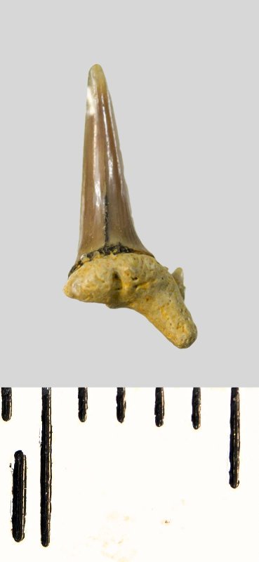 Зуб. Акула. Eostriatolamia subulata (Agassiz, 1843). Классификация: Хордовые Chordata, Позвоночные Vertebrata, Хрящевые рыбы Chondrichthyes, Пластиножаберные Elasmobranchii, Акулы Selachii, Ламнообразные Lamniformes, Песчаные акулы Odontaspididae