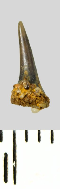 Зуб (фрагмент). Акула. Eostriatolamia subulata (Agassiz, 1843). Классификация: Хордовые Chordata, Позвоночные Vertebrata, Хрящевые рыбы Chondrichthyes, Пластиножаберные Elasmobranchii, Акулы Selachii, Ламнообразные Lamniformes, Песчаные акулы Odontaspididae
