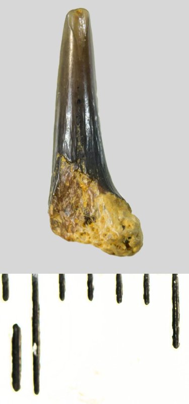 Зуб (фрагмент). Акула. Eostriatolamia subulata (Agassiz, 1843). Классификация: Хордовые Chordata, Позвоночные Vertebrata, Хрящевые рыбы Chondrichthyes, Пластиножаберные Elasmobranchii, Акулы Selachii, Ламнообразные Lamniformes, Песчаные акулы Odontaspididae