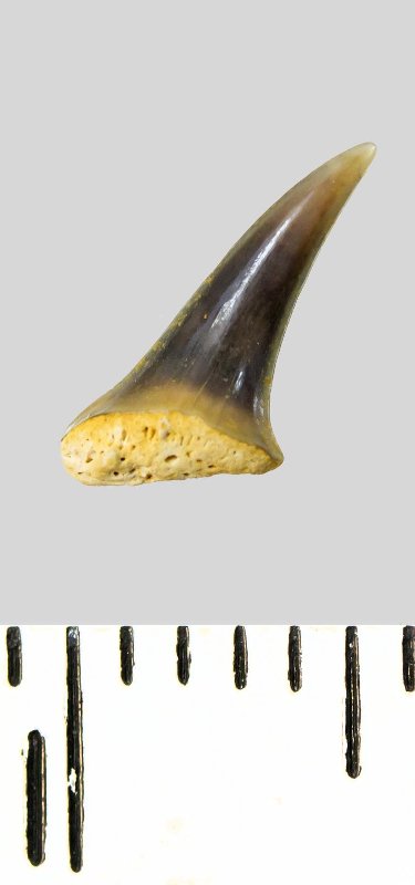 Зуб (фрагмент). Акула. Eostriatolamia subulata (Agassiz, 1843). Классификация: Хордовые Chordata, Позвоночные Vertebrata, Хрящевые рыбы Chondrichthyes, Пластиножаберные Elasmobranchii, Акулы Selachii, Ламнообразные Lamniformes, Песчаные акулы Odontaspididae