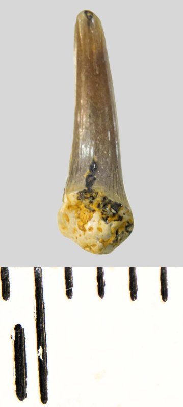 Зуб (фрагмент). Акула. Eostriatolamia subulata (Agassiz, 1843). Классификация: Хордовые Chordata, Позвоночные Vertebrata, Хрящевые рыбы Chondrichthyes, Пластиножаберные Elasmobranchii, Акулы Selachii, Ламнообразные Lamniformes, Песчаные акулы Odontaspididae