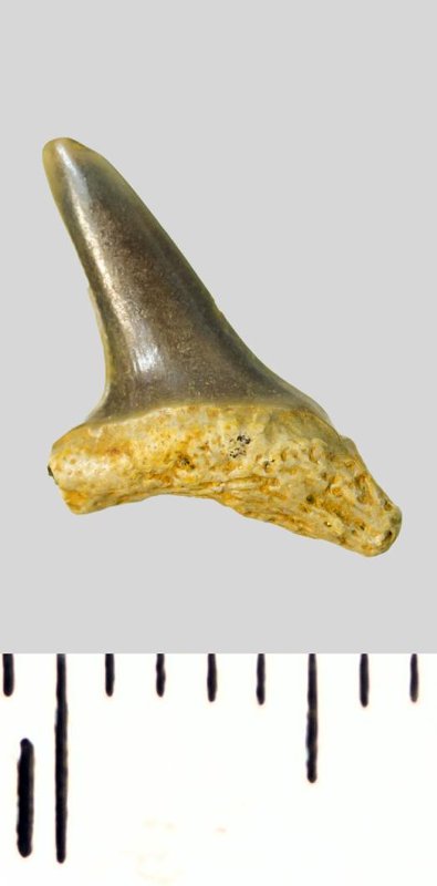 Зуб. Акула. Eostriatolamia subulata (Agassiz, 1843). Классификация: Хордовые Chordata, Позвоночные Vertebrata, Хрящевые рыбы Chondrichthyes, Пластиножаберные Elasmobranchii, Акулы Selachii, Ламнообразные Lamniformes, Песчаные акулы Odontaspididae