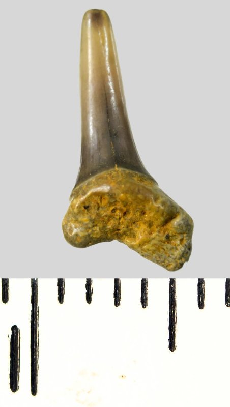 Зуб. Акула. Eostriatolamia subulata (Agassiz, 1843). Классификация: Хордовые Chordata, Позвоночные Vertebrata, Хрящевые рыбы Chondrichthyes, Пластиножаберные Elasmobranchii, Акулы Selachii, Ламнообразные Lamniformes, Песчаные акулы Odontaspididae