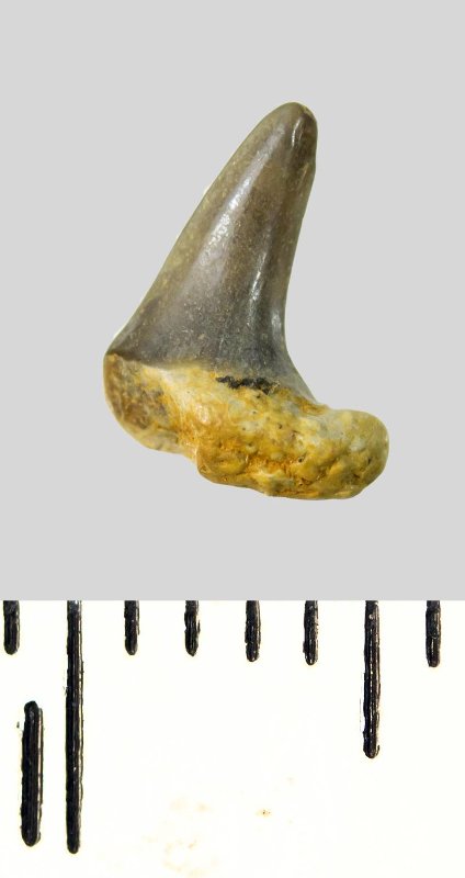Зуб. Акула. Eostriatolamia subulata (Agassiz, 1843). Классификация: Хордовые Chordata, Позвоночные Vertebrata, Хрящевые рыбы Chondrichthyes, Пластиножаберные Elasmobranchii, Акулы Selachii, Ламнообразные Lamniformes, Песчаные акулы Odontaspididae