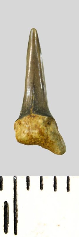 Зуб. Акула. Eostriatolamia subulata (Agassiz, 1843). Классификация: Хордовые Chordata, Позвоночные Vertebrata, Хрящевые рыбы Chondrichthyes, Пластиножаберные Elasmobranchii, Акулы Selachii, Ламнообразные Lamniformes, Песчаные акулы Odontaspididae