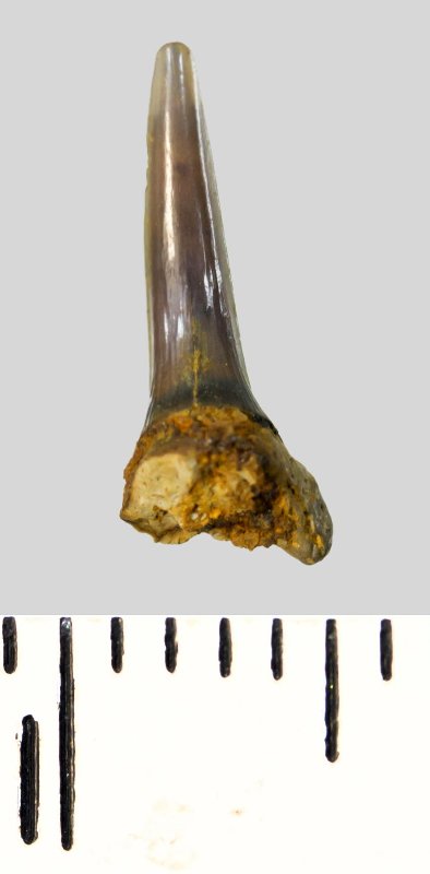 Зуб. Акула. Eostriatolamia subulata (Agassiz, 1843). Классификация: Хордовые Chordata, Позвоночные Vertebrata, Хрящевые рыбы Chondrichthyes, Пластиножаберные Elasmobranchii, Акулы Selachii, Ламнообразные Lamniformes, Песчаные акулы Odontaspididae