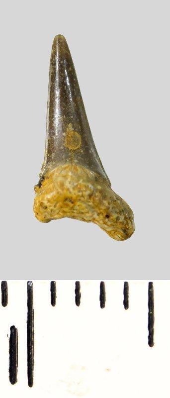 Зуб. Акула. Eostriatolamia subulata (Agassiz, 1843). Классификация: Хордовые Chordata, Позвоночные Vertebrata, Хрящевые рыбы Chondrichthyes, Пластиножаберные Elasmobranchii, Акулы Selachii, Ламнообразные Lamniformes, Песчаные акулы Odontaspididae