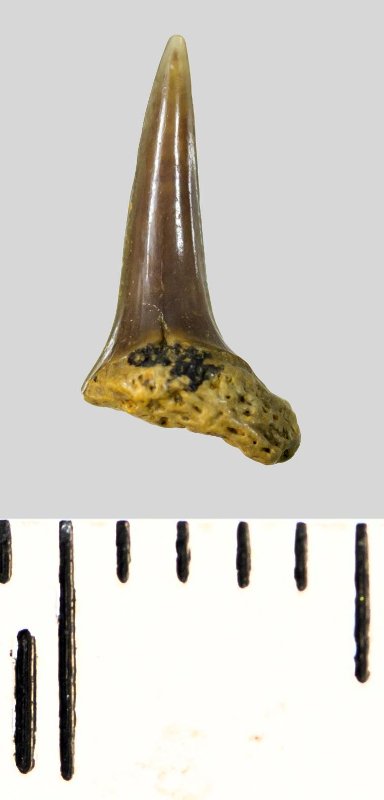 Зуб. Акула. Eostriatolamia subulata (Agassiz, 1843). Классификация: Хордовые Chordata, Позвоночные Vertebrata, Хрящевые рыбы Chondrichthyes, Пластиножаберные Elasmobranchii, Акулы Selachii, Ламнообразные Lamniformes, Песчаные акулы Odontaspididae