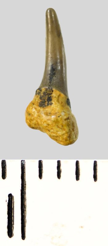 Зуб. Акула. Eostriatolamia subulata (Agassiz, 1843). Классификация: Хордовые Chordata, Позвоночные Vertebrata, Хрящевые рыбы Chondrichthyes, Пластиножаберные Elasmobranchii, Акулы Selachii, Ламнообразные Lamniformes, Песчаные акулы Odontaspididae