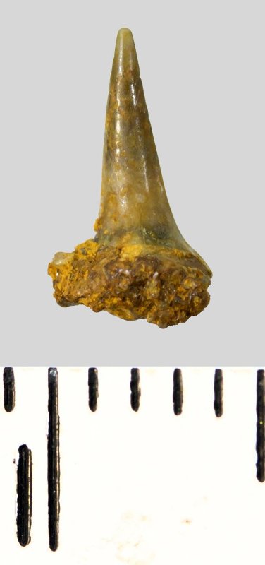 Зуб. Акула. Eostriatolamia subulata (Agassiz, 1843). Классификация: Хордовые Chordata, Позвоночные Vertebrata, Хрящевые рыбы Chondrichthyes, Пластиножаберные Elasmobranchii, Акулы Selachii, Ламнообразные Lamniformes, Песчаные акулы Odontaspididae