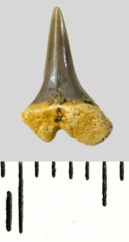Зуб. Акула. Eostriatolamia subulata (Agassiz, 1843). Классификация: Хордовые Chordata, Позвоночные Vertebrata, Хрящевые рыбы Chondrichthyes, Пластиножаберные Elasmobranchii, Акулы Selachii, Ламнообразные Lamniformes, Песчаные акулы Odontaspididae