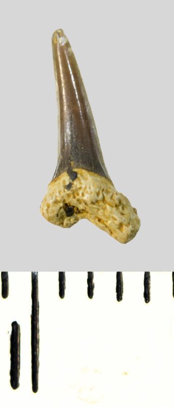 Зуб. Акула. Eostriatolamia subulata (Agassiz, 1843). Классификация: Хордовые Chordata, Позвоночные Vertebrata, Хрящевые рыбы Chondrichthyes, Пластиножаберные Elasmobranchii, Акулы Selachii, Ламнообразные Lamniformes, Песчаные акулы Odontaspididae