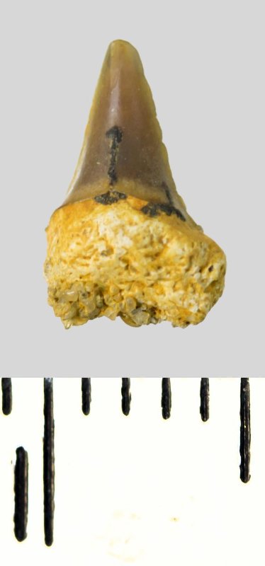 Зуб. Акула. Eostriatolamia subulata (Agassiz, 1843). Классификация: Хордовые Chordata, Позвоночные Vertebrata, Хрящевые рыбы Chondrichthyes, Пластиножаберные Elasmobranchii, Акулы Selachii, Ламнообразные Lamniformes, Песчаные акулы Odontaspididae