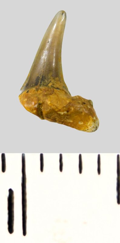 Зуб. Акула. Eostriatolamia subulata (Agassiz, 1843). Классификация: Хордовые Chordata, Позвоночные Vertebrata, Хрящевые рыбы Chondrichthyes, Пластиножаберные Elasmobranchii, Акулы Selachii, Ламнообразные Lamniformes, Песчаные акулы Odontaspididae
