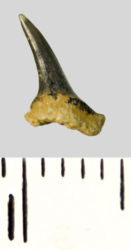 Зуб. Акула. Eostriatolamia subulata (Agassiz, 1843). Классификация: Хордовые Chordata, Позвоночные Vertebrata, Хрящевые рыбы Chondrichthyes, Пластиножаберные Elasmobranchii, Акулы Selachii, Ламнообразные Lamniformes, Песчаные акулы Odontaspididae