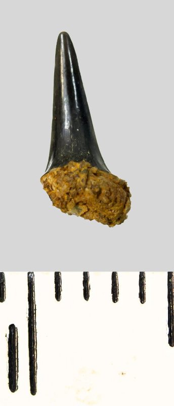 Зуб. Акула. Eostriatolamia subulata (Agassiz, 1843). Классификация: Хордовые Chordata, Позвоночные Vertebrata, Хрящевые рыбы Chondrichthyes, Пластиножаберные Elasmobranchii, Акулы Selachii, Ламнообразные Lamniformes, Песчаные акулы Odontaspididae
