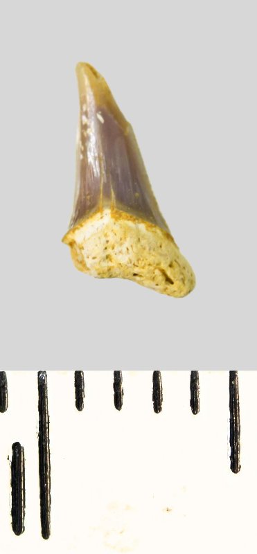 Зуб. Акула. Eostriatolamia subulata (Agassiz, 1843). Классификация: Хордовые Chordata, Позвоночные Vertebrata, Хрящевые рыбы Chondrichthyes, Пластиножаберные Elasmobranchii, Акулы Selachii, Ламнообразные Lamniformes, Песчаные акулы Odontaspididae