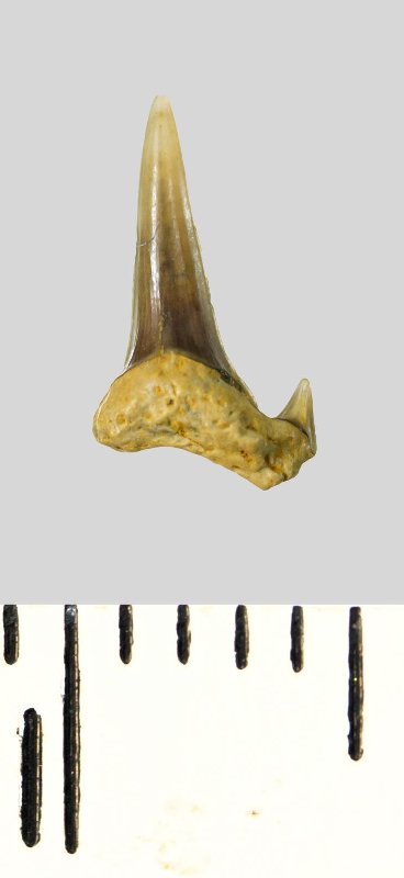 Зуб. Акула. Eostriatolamia subulata (Agassiz, 1843). Классификация: Хордовые Chordata, Позвоночные Vertebrata, Хрящевые рыбы Chondrichthyes, Пластиножаберные Elasmobranchii, Акулы Selachii, Ламнообразные Lamniformes, Песчаные акулы Odontaspididae