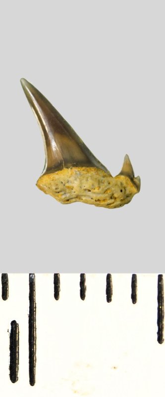 Зуб. Акула. Eostriatolamia subulata (Agassiz, 1843). Классификация: Хордовые Chordata, Позвоночные Vertebrata, Хрящевые рыбы Chondrichthyes, Пластиножаберные Elasmobranchii, Акулы Selachii, Ламнообразные Lamniformes, Песчаные акулы Odontaspididae