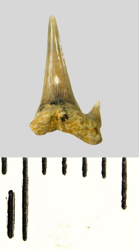 Зуб. Акула. Eostriatolamia subulata (Agassiz, 1843). Классификация: Хордовые Chordata, Позвоночные Vertebrata, Хрящевые рыбы Chondrichthyes, Пластиножаберные Elasmobranchii, Акулы Selachii, Ламнообразные Lamniformes, Песчаные акулы Odontaspididae