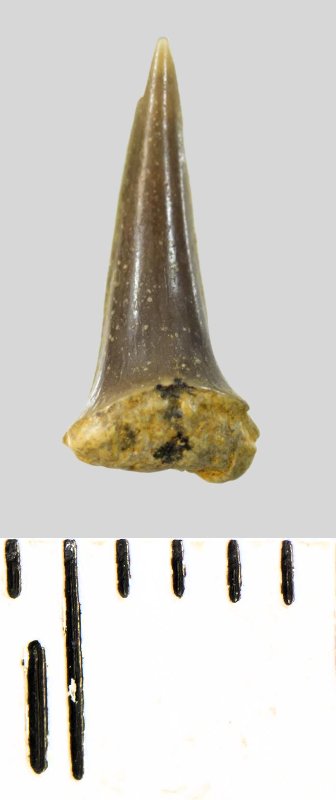 Зуб (фрагмент). Акула. Eostriatolamia subulata (Agassiz, 1843). Классификация: Хордовые Chordata, Позвоночные Vertebrata, Хрящевые рыбы Chondrichthyes, Пластиножаберные Elasmobranchii, Акулы Selachii, Ламнообразные Lamniformes, Песчаные акулы Odontaspididae