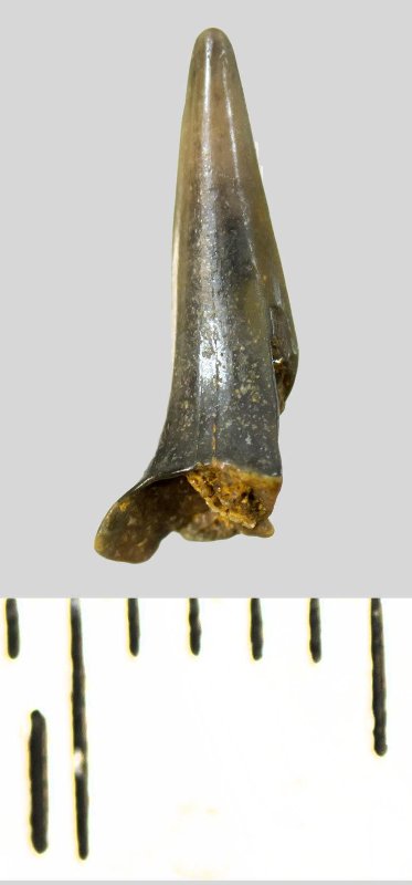 Зуб (фрагмент). Акула. Eostriatolamia subulata (Agassiz, 1843). Классификация: Хордовые Chordata, Позвоночные Vertebrata, Хрящевые рыбы Chondrichthyes, Пластиножаберные Elasmobranchii, Акулы Selachii, Ламнообразные Lamniformes, Песчаные акулы Odontaspididae