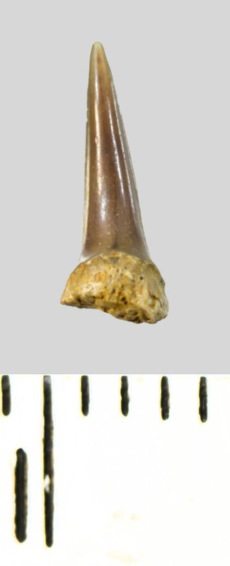 Зуб (фрагмент). Акула. Eostriatolamia subulata (Agassiz, 1843). Классификация: Хордовые Chordata, Позвоночные Vertebrata, Хрящевые рыбы Chondrichthyes, Пластиножаберные Elasmobranchii, Акулы Selachii, Ламнообразные Lamniformes, Песчаные акулы Odontaspididae