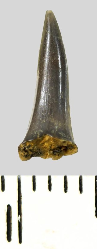 Коронка мелкого бокового зуба серого цвета, колюще-режущего типа, S-образно изогнутая, с гладким режущим краем. С лингвальной стороны у основания коронки на эмали имеется скульптура в виде слабой продольной струйчатости. Корень не сохранился