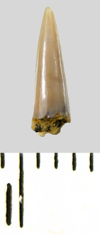 Коронка мелкого бокового зуба серого цвета, колюще-режущего типа, S-образно изогнутая, с гладким режущим краем. С лингвальной стороны у основания коронки на эмали имеется скульптура в виде слабой продольной струйчатости. Корень не сохранился