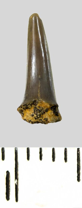 Коронка мелкого бокового зуба серого цвета, колюще-режущего типа, S-образно изогнутая, с гладким режущим краем. С лингвальной стороны у основания коронки на эмали имеется скульптура в виде слабой продольной струйчатости. Корень не сохранился