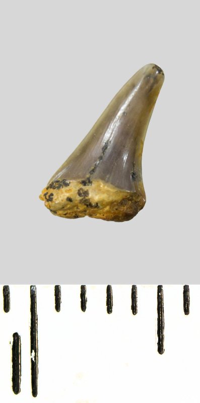 Зуб (фрагмент). Акула. Eostriatolamia subulata (Agassiz, 1843). Классификация: Хордовые Chordata, Позвоночные Vertebrata, Хрящевые рыбы Chondrichthyes, Пластиножаберные Elasmobranchii, Акулы Selachii, Ламнообразные Lamniformes, Песчаные акулы Odontaspididae