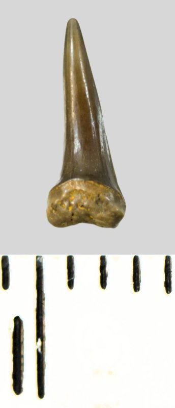 Зуб (фрагмент). Акула. Eostriatolamia subulata (Agassiz, 1843). Классификация: Хордовые Chordata, Позвоночные Vertebrata, Хрящевые рыбы Chondrichthyes, Пластиножаберные Elasmobranchii, Акулы Selachii, Ламнообразные Lamniformes, Песчаные акулы Odontaspididae