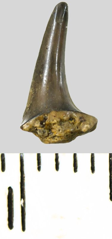 Зуб (фрагмент). Акула. Eostriatolamia subulata (Agassiz, 1843). Классификация: Хордовые Chordata, Позвоночные Vertebrata, Хрящевые рыбы Chondrichthyes, Пластиножаберные Elasmobranchii, Акулы Selachii, Ламнообразные Lamniformes, Песчаные акулы Odontaspididae