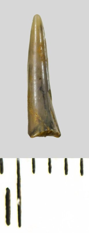 Коронка мелкого бокового зуба серого цвета, колюще-режущего типа, S-образно изогнутая, с гладким режущим краем. С лингвальной стороны у основания коронки на эмали имеется скульптура в виде слабой продольной струйчатости. Корень не сохранился