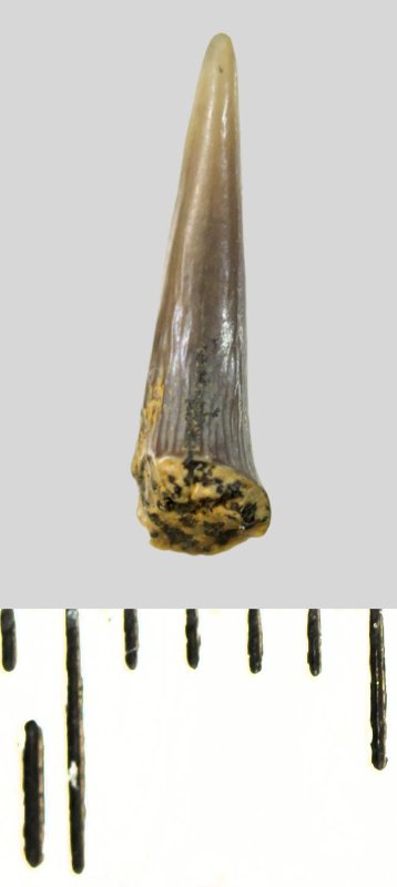 Коронка мелкого бокового зуба серого цвета, колюще-режущего типа, S-образно изогнутая, с гладким режущим краем. С лингвальной стороны у основания коронки на эмали имеется скульптура в виде слабой продольной струйчатости. Корень не сохранился