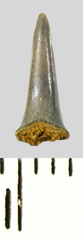 Коронка мелкого бокового зуба серого цвета, колюще-режущего типа, S-образно изогнутая, с гладким режущим краем. С лингвальной стороны у основания коронки на эмали имеется скульптура в виде слабой продольной струйчатости. Корень не сохранился