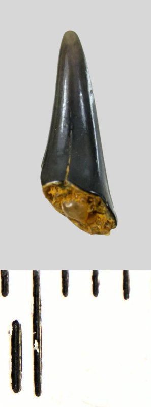 Зуб (фрагмент). Акула. Eostriatolamia subulata (Agassiz, 1843). Классификация: Хордовые Chordata, Позвоночные Vertebrata, Хрящевые рыбы Chondrichthyes, Пластиножаберные Elasmobranchii, Акулы Selachii, Ламнообразные Lamniformes, Песчаные акулы Odontaspididae