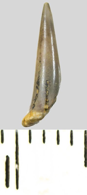 Коронка мелкого бокового зуба серого цвета, колюще-режущего типа, S-образно изогнутая, с гладким режущим краем. С лингвальной стороны у основания коронки на эмали имеется скульптура в виде слабой продольной струйчатости. Корень не сохранился