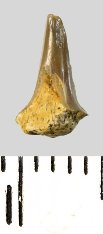 Зуб (фрагмент). Акула. Eostriatolamia subulata (Agassiz, 1843). Классификация: Хордовые Chordata, Позвоночные Vertebrata, Хрящевые рыбы Chondrichthyes, Пластиножаберные Elasmobranchii, Акулы Selachii, Ламнообразные Lamniformes, Песчаные акулы Odontaspididae