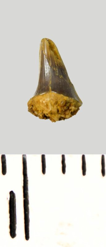 Зуб (фрагмент). Акула. Eostriatolamia subulata (Agassiz, 1843). Классификация: Хордовые Chordata, Позвоночные Vertebrata, Хрящевые рыбы Chondrichthyes, Пластиножаберные Elasmobranchii, Акулы Selachii, Ламнообразные Lamniformes, Песчаные акулы Odontaspididae