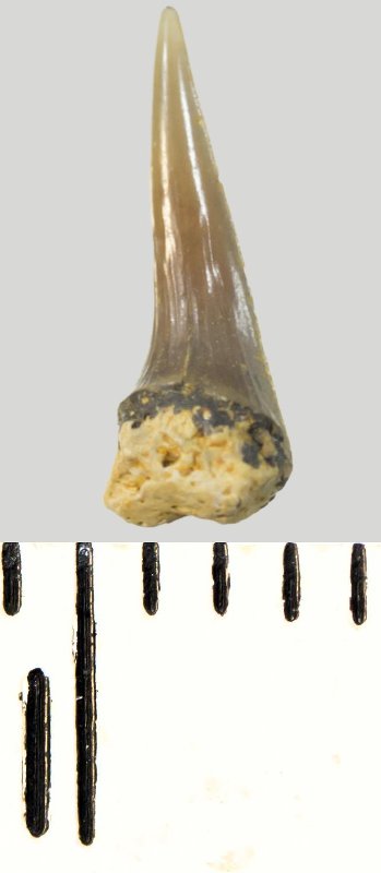 Зуб (фрагмент). Акула. Eostriatolamia subulata (Agassiz, 1843). Классификация: Хордовые Chordata, Позвоночные Vertebrata, Хрящевые рыбы Chondrichthyes, Пластиножаберные Elasmobranchii, Акулы Selachii, Ламнообразные Lamniformes, Песчаные акулы Odontaspididae