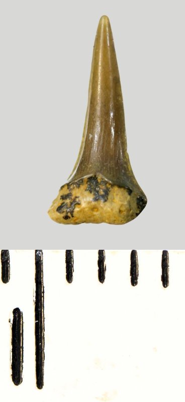 Зуб (фрагмент). Акула. Eostriatolamia subulata (Agassiz, 1843). Классификация: Хордовые Chordata, Позвоночные Vertebrata, Хрящевые рыбы Chondrichthyes, Пластиножаберные Elasmobranchii, Акулы Selachii, Ламнообразные Lamniformes, Песчаные акулы Odontaspididae