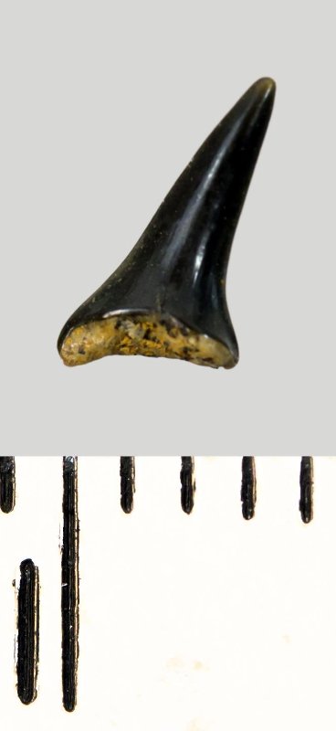 Зуб (фрагмент). Акула. Eostriatolamia subulata (Agassiz, 1843). Классификация: Хордовые Chordata, Позвоночные Vertebrata, Хрящевые рыбы Chondrichthyes, Пластиножаберные Elasmobranchii, Акулы Selachii, Ламнообразные Lamniformes, Песчаные акулы Odontaspididae