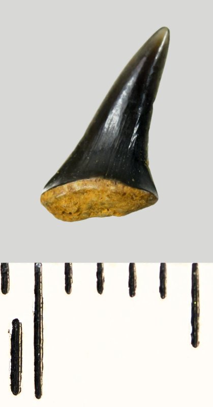 Зуб (фрагмент). Акула. Eostriatolamia subulata (Agassiz, 1843). Классификация: Хордовые Chordata, Позвоночные Vertebrata, Хрящевые рыбы Chondrichthyes, Пластиножаберные Elasmobranchii, Акулы Selachii, Ламнообразные Lamniformes, Песчаные акулы Odontaspididae