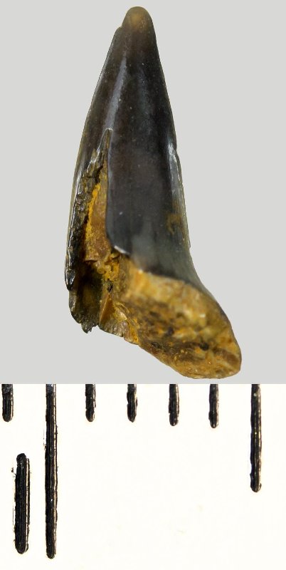 Зуб (фрагмент). Акула. Eostriatolamia subulata (Agassiz, 1843). Классификация: Хордовые Chordata, Позвоночные Vertebrata, Хрящевые рыбы Chondrichthyes, Пластиножаберные Elasmobranchii, Акулы Selachii, Ламнообразные Lamniformes, Песчаные акулы Odontaspididae