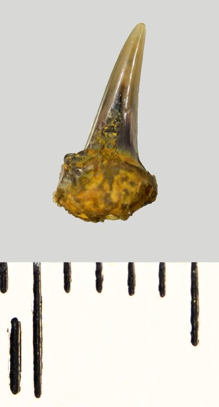 Зуб (фрагмент). Акула. Eostriatolamia subulata (Agassiz, 1843). Классификация: Хордовые Chordata, Позвоночные Vertebrata, Хрящевые рыбы Chondrichthyes, Пластиножаберные Elasmobranchii, Акулы Selachii, Ламнообразные Lamniformes, Песчаные акулы Odontaspididae