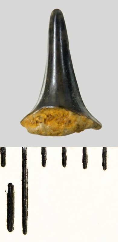 Зуб (фрагмент). Акула. Eostriatolamia subulata (Agassiz, 1843). Классификация: Хордовые Chordata, Позвоночные Vertebrata, Хрящевые рыбы Chondrichthyes, Пластиножаберные Elasmobranchii, Акулы Selachii, Ламнообразные Lamniformes, Песчаные акулы Odontaspididae
