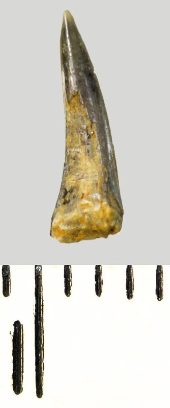 Коронка мелкого бокового зуба серого цвета, колюще-режущего типа, S-образно изогнутая, с гладким режущим краем. С лингвальной стороны у основания коронки на эмали имеется скульптура в виде слабой продольной струйчатости. Корень не сохранился