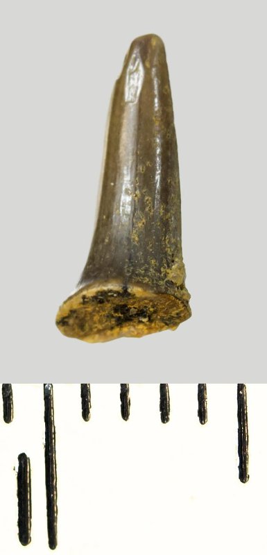 Коронка мелкого бокового зуба серого цвета, колюще-режущего типа, S-образно изогнутая, с гладким режущим краем. С лингвальной стороны у основания коронки на эмали имеется скульптура в виде слабой продольной струйчатости. Корень не сохранился