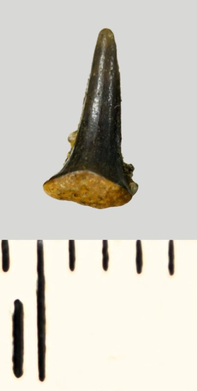Зуб (фрагмент). Акула. Eostriatolamia subulata (Agassiz, 1843). Классификация: Хордовые Chordata, Позвоночные Vertebrata, Хрящевые рыбы Chondrichthyes, Пластиножаберные Elasmobranchii, Акулы Selachii, Ламнообразные Lamniformes, Песчаные акулы Odontaspididae